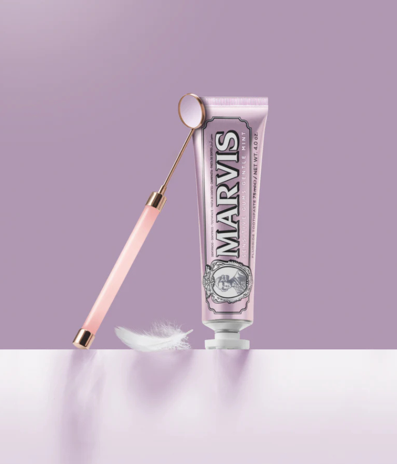Découvrez le dentifrice Marvis pour gencives sensibles. Retrouvez le style, le design et le goût emblématiques de Marvis, associés à une formule innovante spécialement conçue pour les gencives sensibles. Son parfum délicat de menthe verte crémeuse, rehaussé d’une touche de menthe poivrée et de menthol, apporte profondeur et fraîcheur. Utilisé quotidiennement, il contribue à améliorer la santé des gencives, à réduire la sensibilité, à prévenir les caries, à lutter contre le tartre et la plaque dentaire, et à maintenir une haleine fraîche. Fabriqué en Italie.